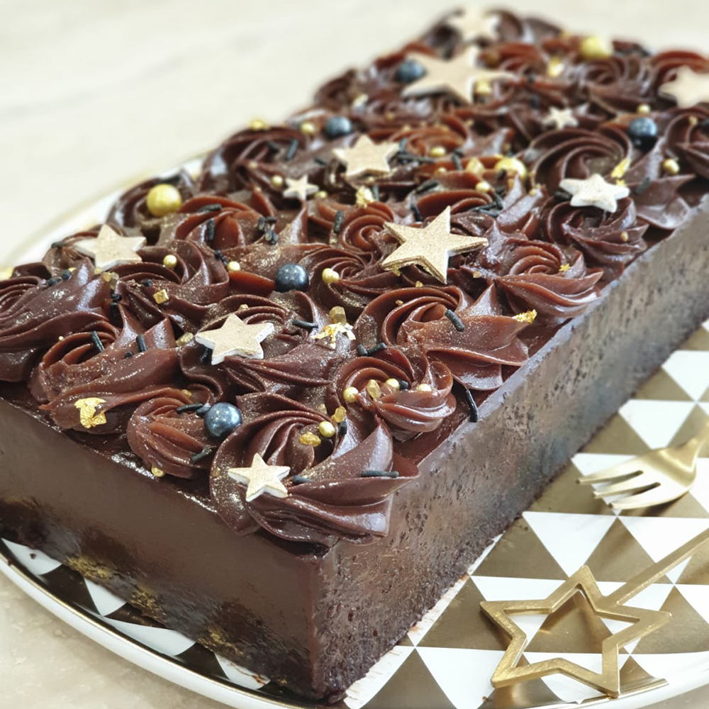 The ultimate chocolate indulgence. The Chocolate Decadence sheet cake is sheer chocolate heaven for all chocolate lovers with its moist chocolate cake and chocolate ganache rosettes, speckled with gold stars and sprinkles.
