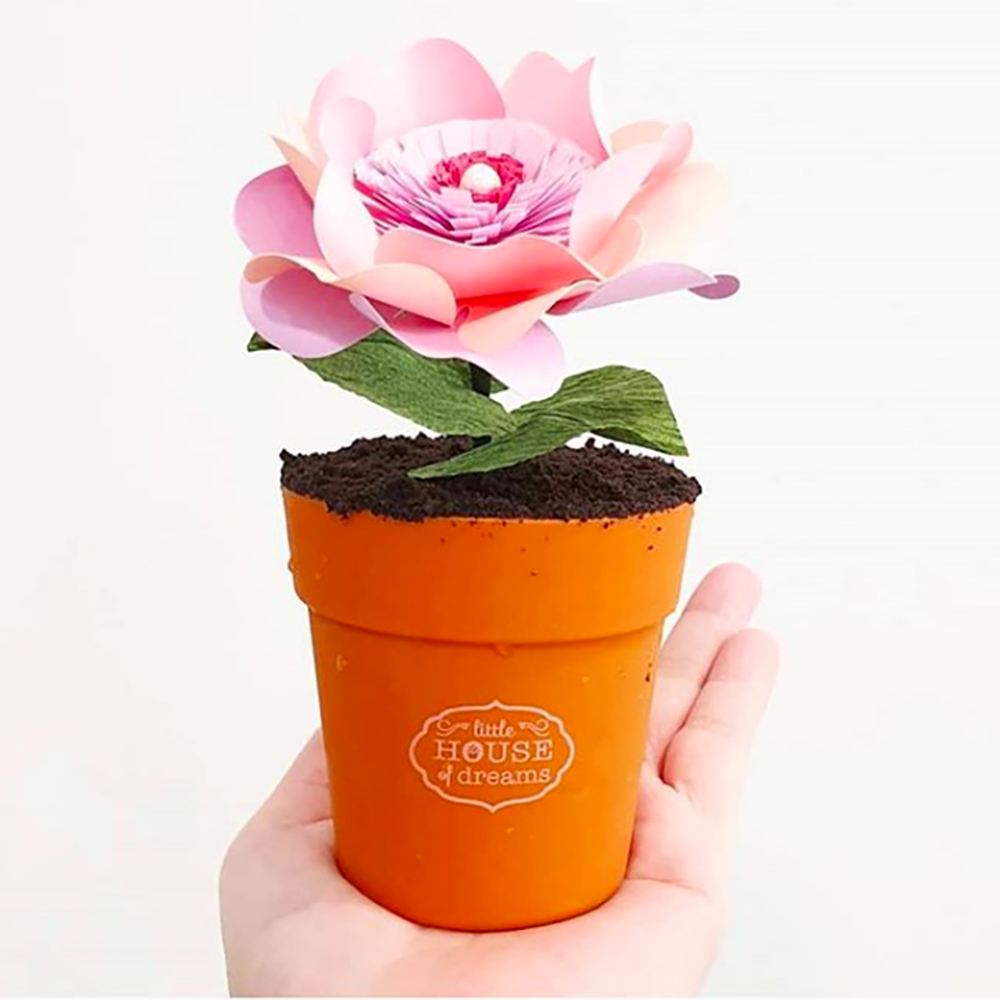 A handcrafted paper flower by Rainbow Carousel planted in a pot of delicious moist chocolate cake. $2 from each purchase goes back to the beneficiaries of Rainbow Carousel.