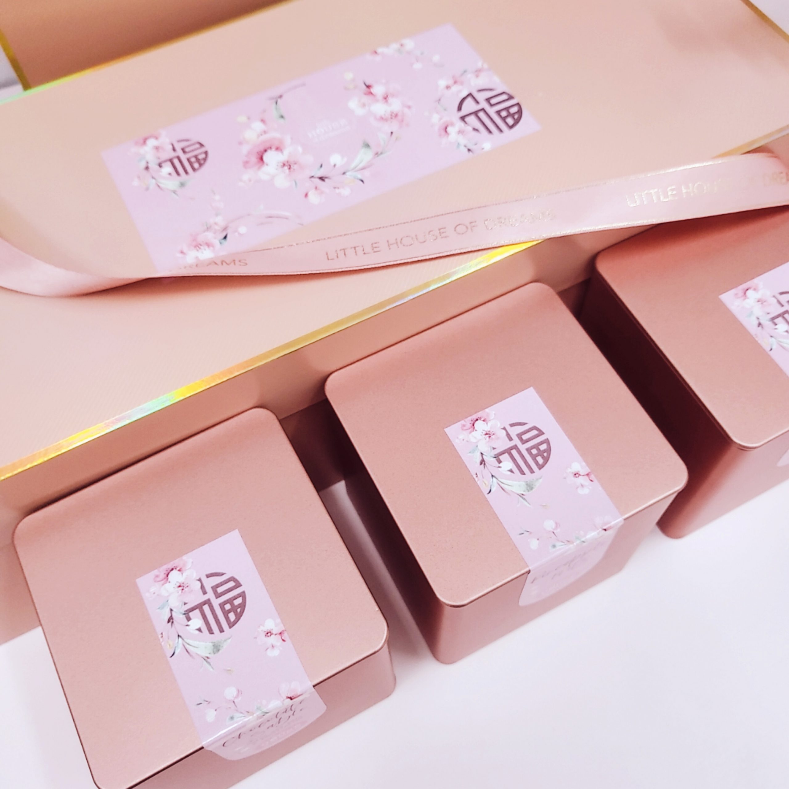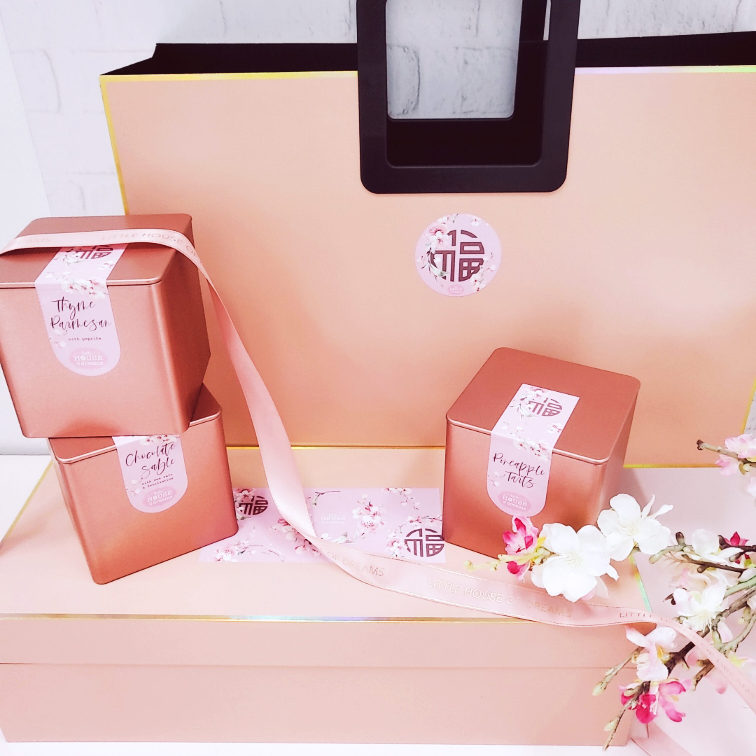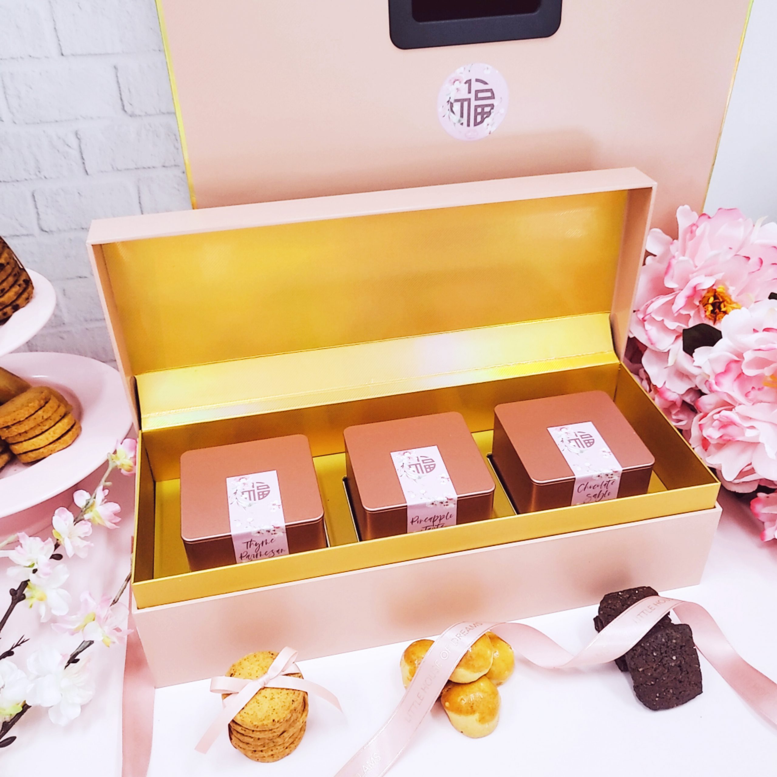 Consists of signature pineapple tarts and 2 new artisan cookie creations: Thyme & Parmesan with paprika + Chocolate Sable with sea salt and feuilletine. Packaged in a lovely rose gold tin each and presented in a beautiful pearlescent rose pink box with holographic borders and gold interior. Matching carrier bag included. Delivery & collection available from 18 January 2021.
