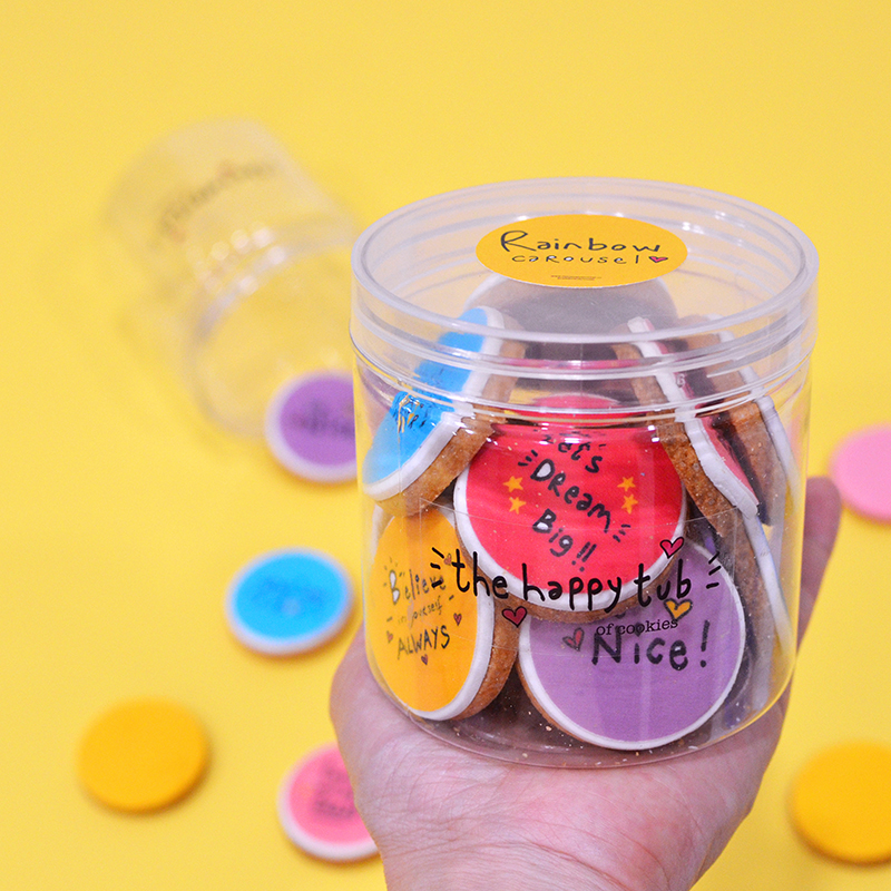 This Happy Tub is designed by our founder and features an assortment of happy motivational messages in happy fun colors. Each tub consists of 18 happy cookies!